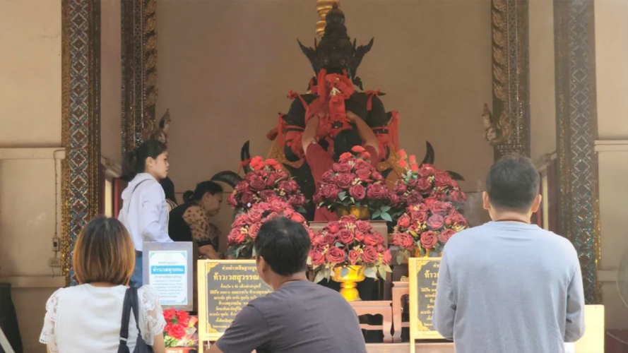 ไม่พลาดส่องโต๊ะบวงสรวงแก้บน หลังจากที่เจ้าภาพได้อธิษฐานขอโชคขอลาภ และจุดธูปเสี่ยงโชค เมื่อพิธีบวงสรวงเสร็จสิ้น ผู้คนต่างเดินเข้าไปส่องตัวเลขธูปที่หวีกล้วย ปรากฎเลข 367 - 763