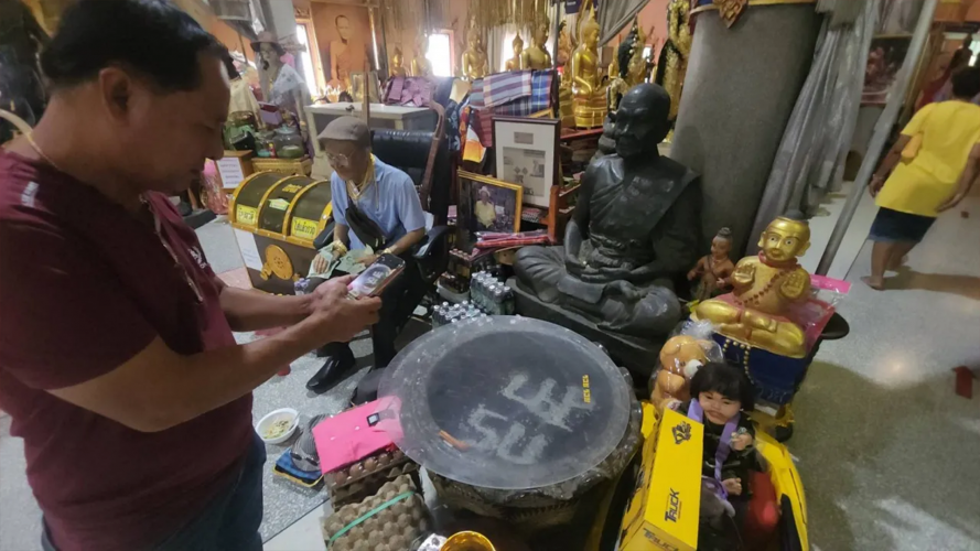 สาธุชนที่หวังรายทางลัดก่อนหวยออก ต่างมารุมจับจ้องกับตัวเลขหยดน้ำตาเทียนในอ่างน้ำมนต์กันอย่างเนื่องแน่น เพราะมีความเชื่อว่า "ตาทองงิ้วราย" มักจะให้โชคให้ลาภ กับชาวบ้านที่มาขอโชคขอลาภ นอกจากอ่างน้ำมนต์ ยังได้ยินเสียงเขย่าเซียมซีดังตลอดเวลา หรือล่วงไข่ในไห ที่ด้านหน้าหุ่นปั้น